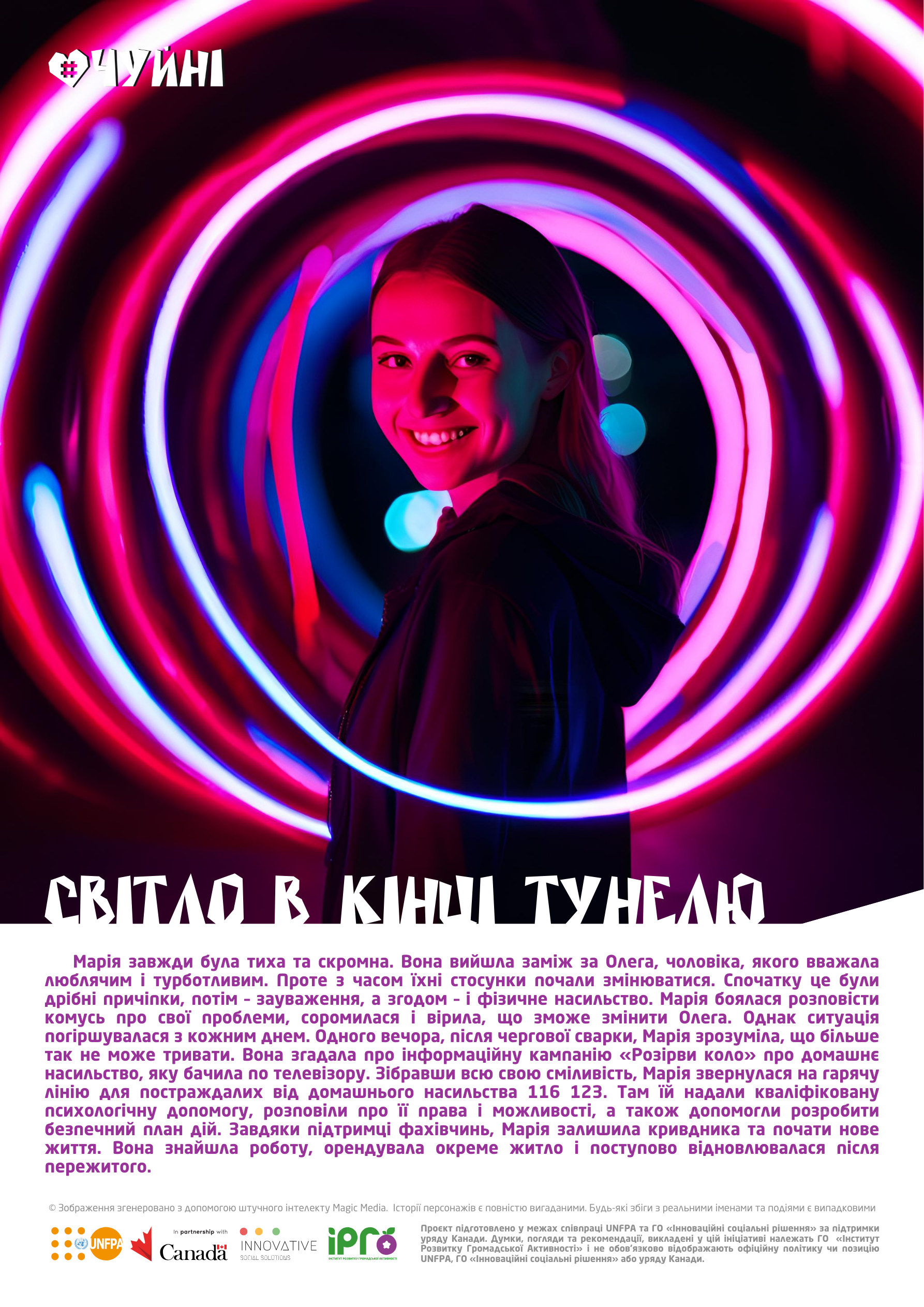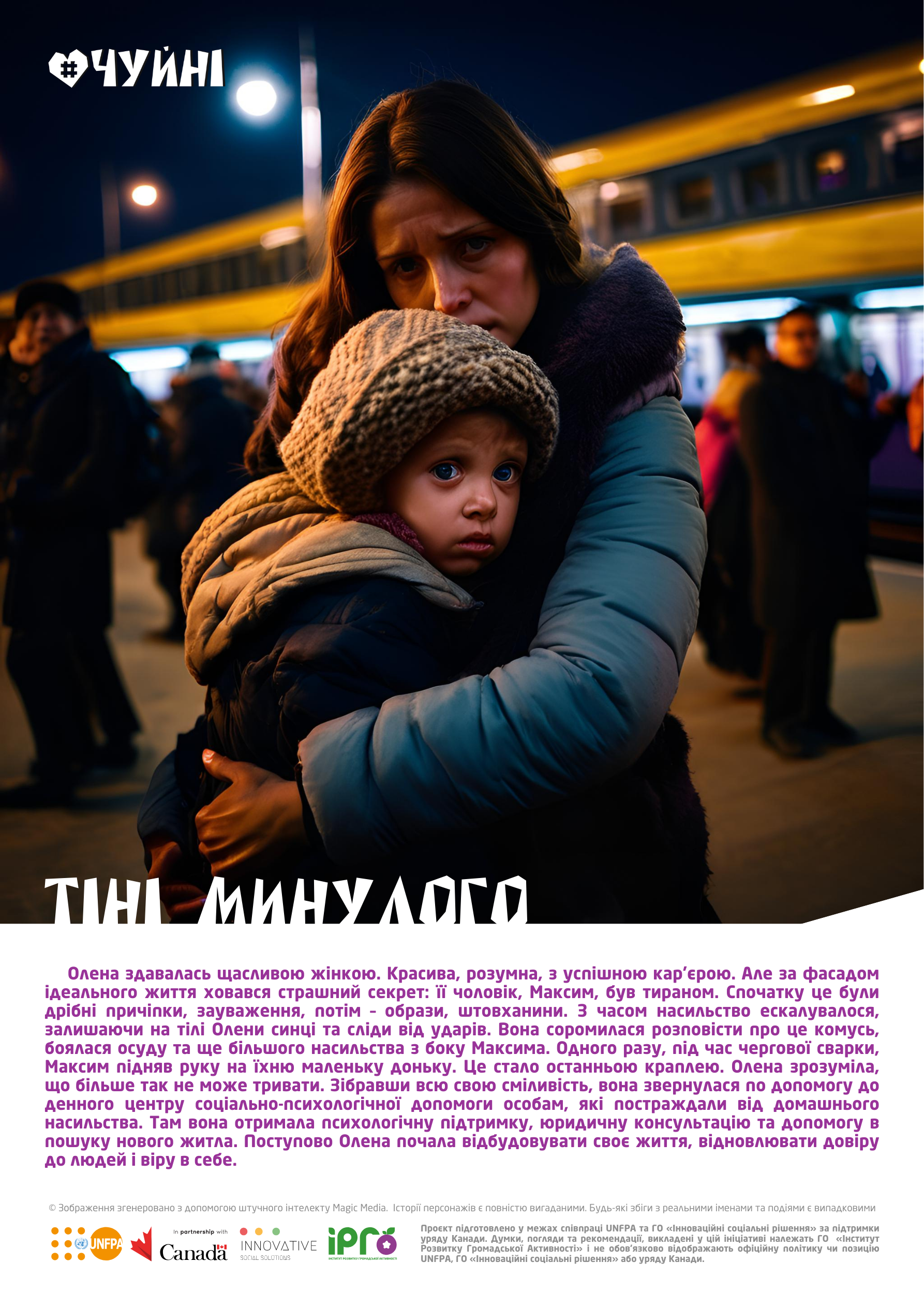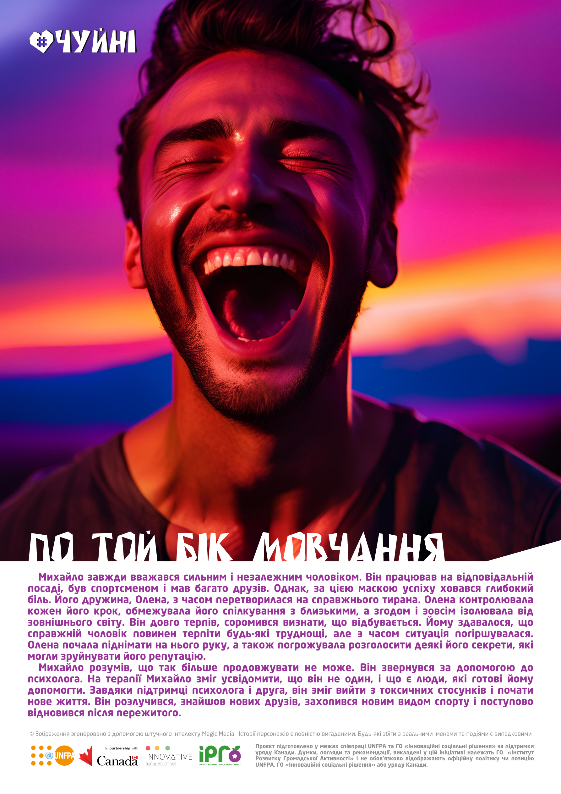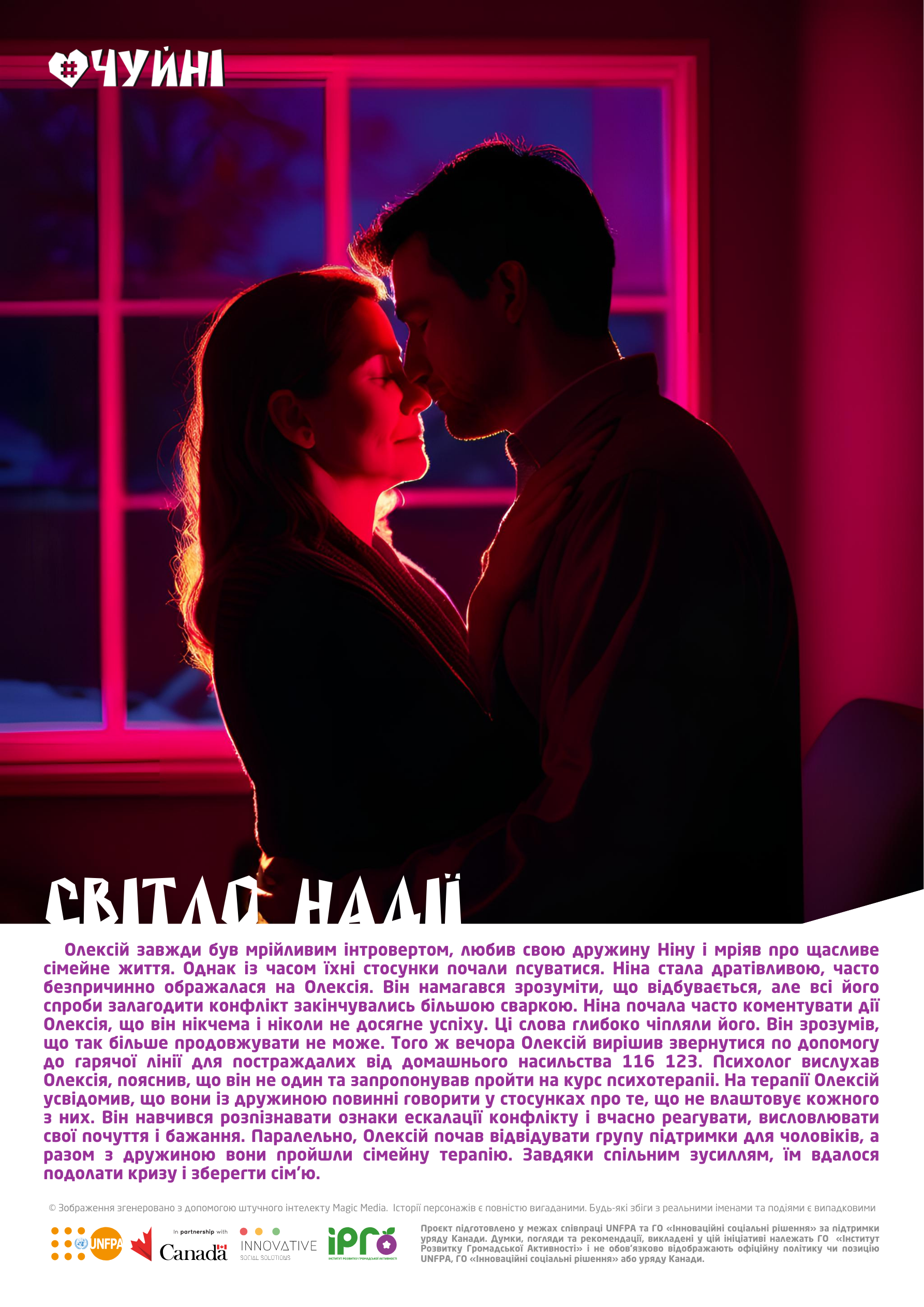 © Зображення згенеровано з допомогою штучного інтелекту Magic Media. Історії персонажів є повністю вигаданими. Будь-які збіги з реальними іменами та подіями є випадковими. Проєкт підготовлено у межах співпраці UNFPA та ГО «Інноваційні соціальні рішення» за підтримки уряду Канади. Думки, погляди та рекомендації, викладені у цій ініціативі належать ГО «Інститут Розвитку Громадської Активності» і не обов’язково відображають офіційну політику чи позицію UNFPA, ГО «Інноваційні соціальні рішення» або уряду Канади.