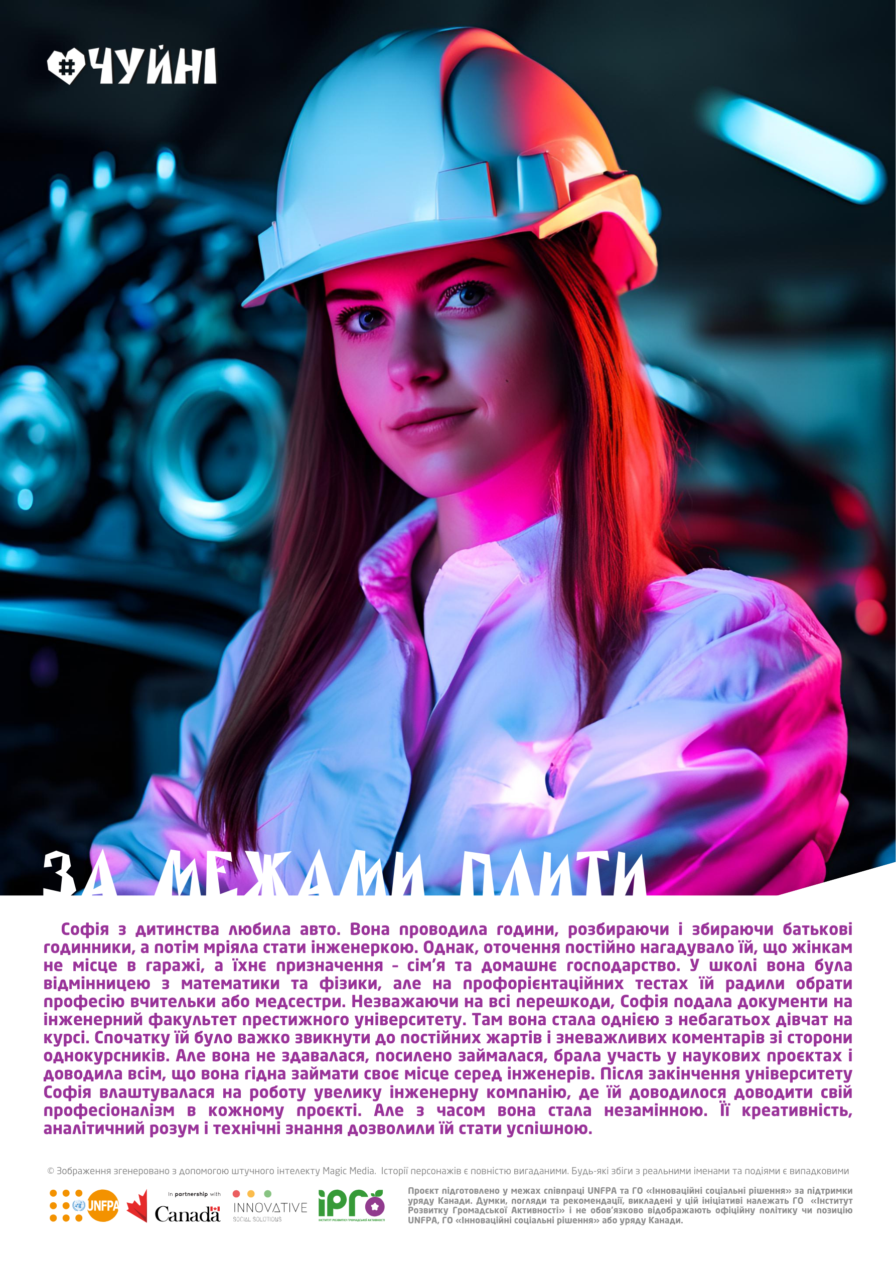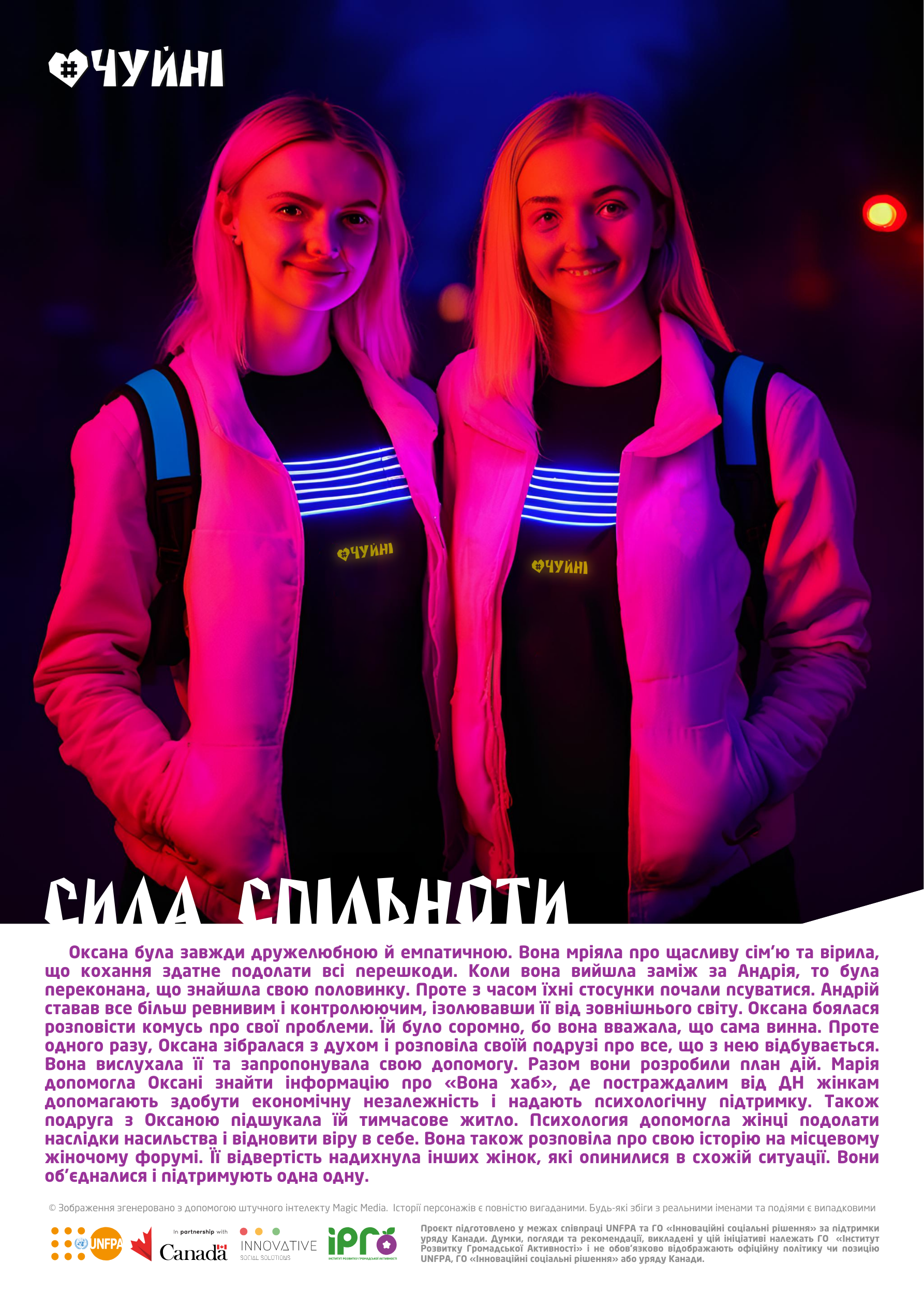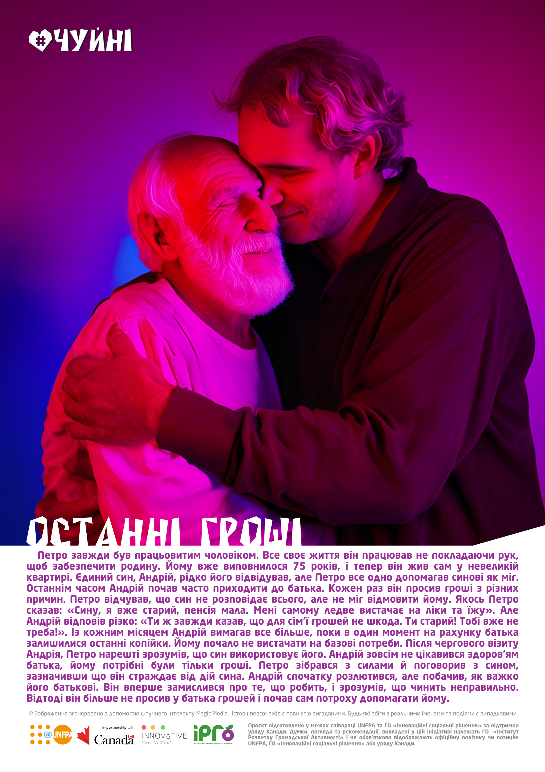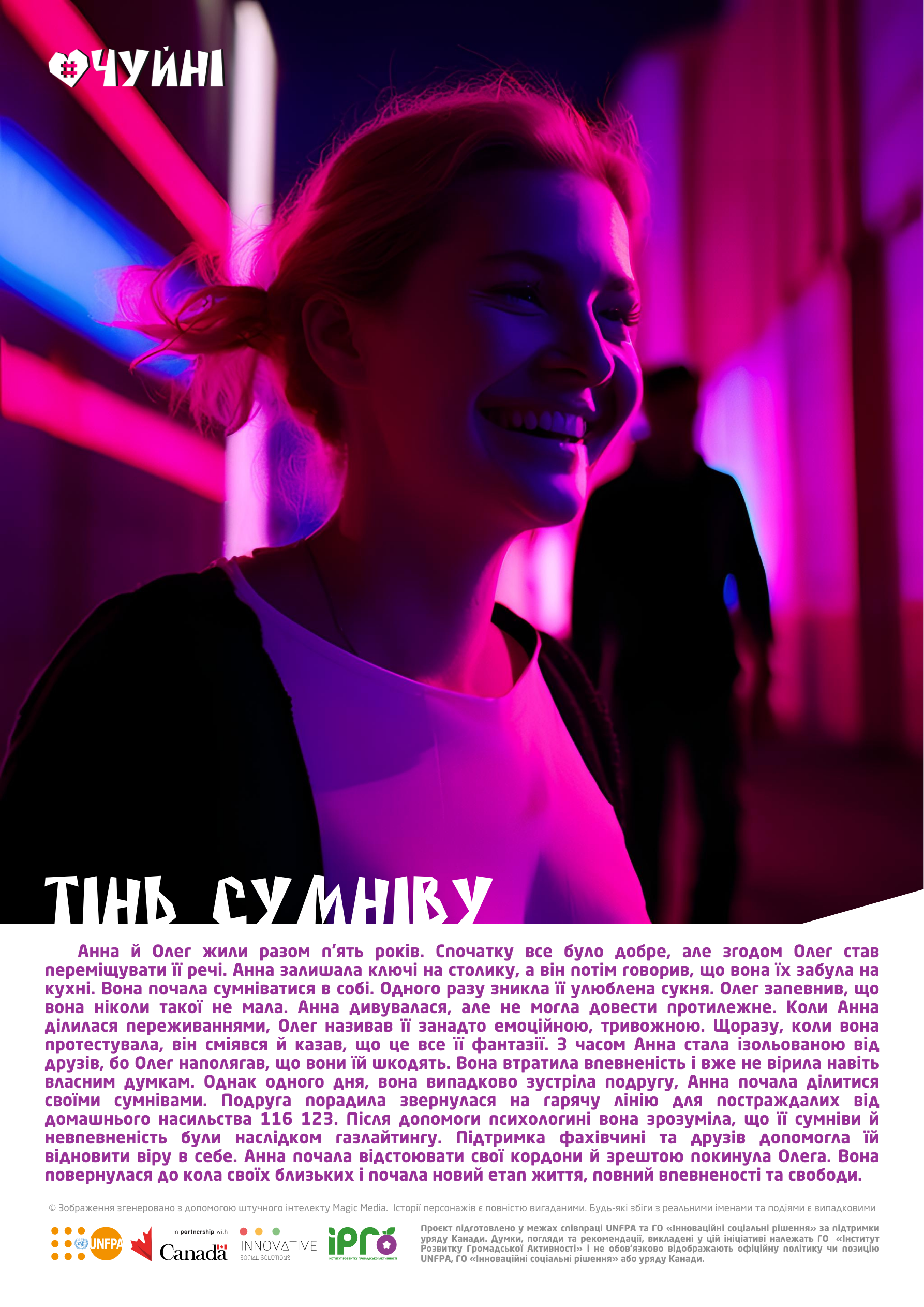 © Зображення згенеровано з допомогою штучного інтелекту Magic Media. Історії персонажів є повністю вигаданими. Будь-які збіги з реальними іменами та подіями є випадковими. Проєкт підготовлено у межах співпраці UNFPA та ГО «Інноваційні соціальні рішення» за підтримки уряду Канади. Думки, погляди та рекомендації, викладені у цій ініціативі належать ГО «Інститут Розвитку Громадської Активності» і не обов’язково відображають офіційну політику чи позицію UNFPA, ГО «Інноваційні соціальні рішення» або уряду Канади.