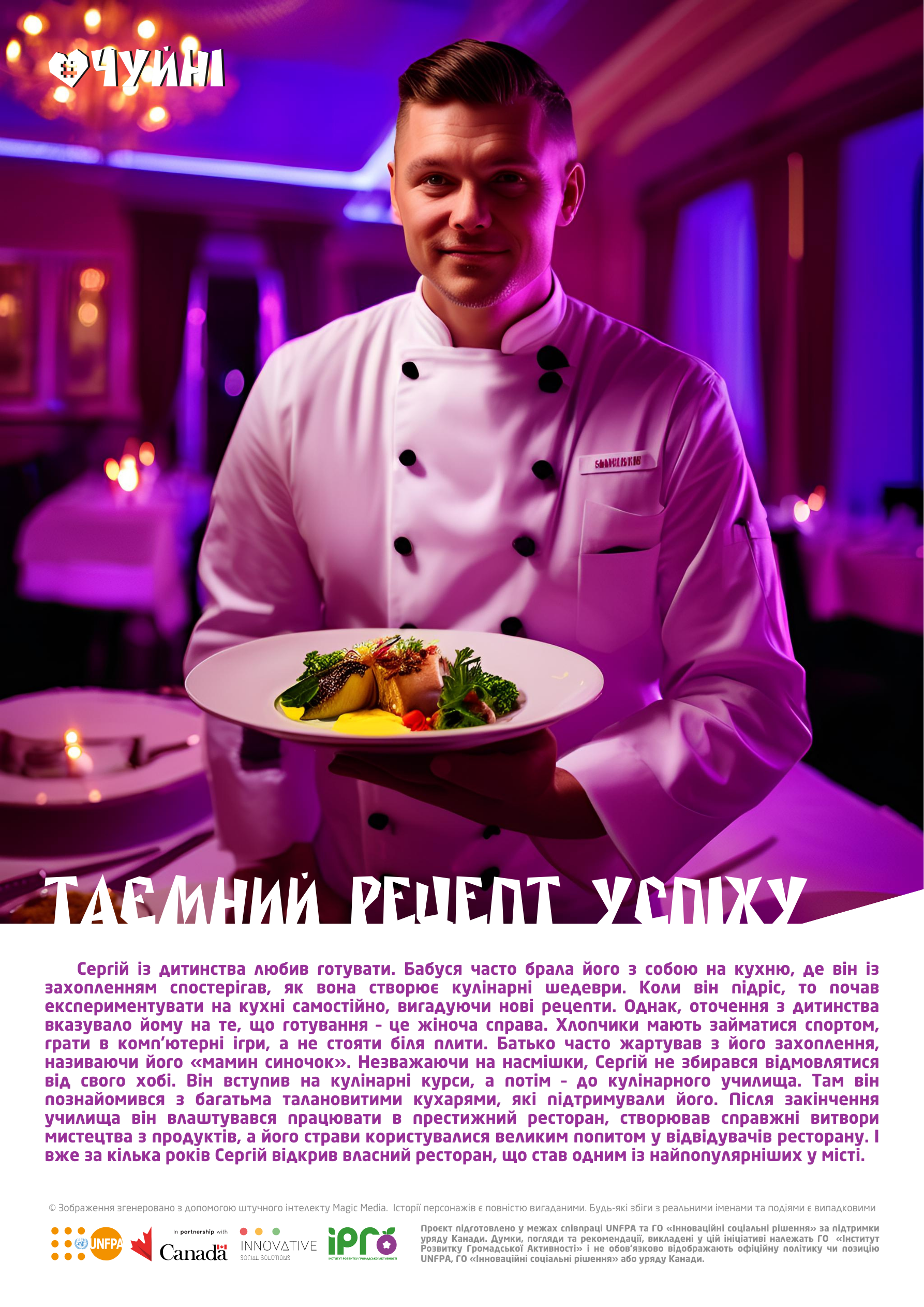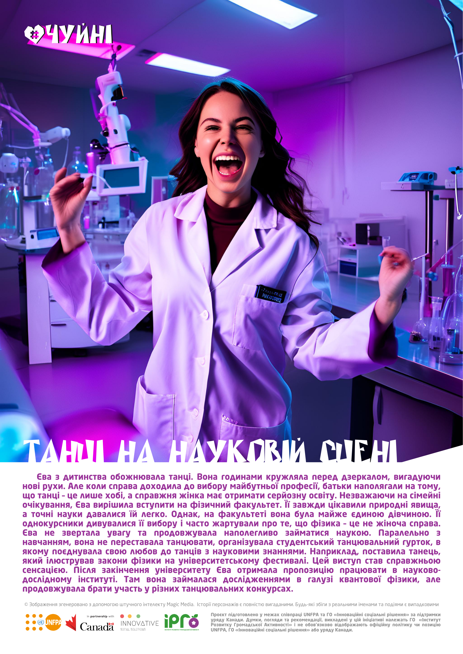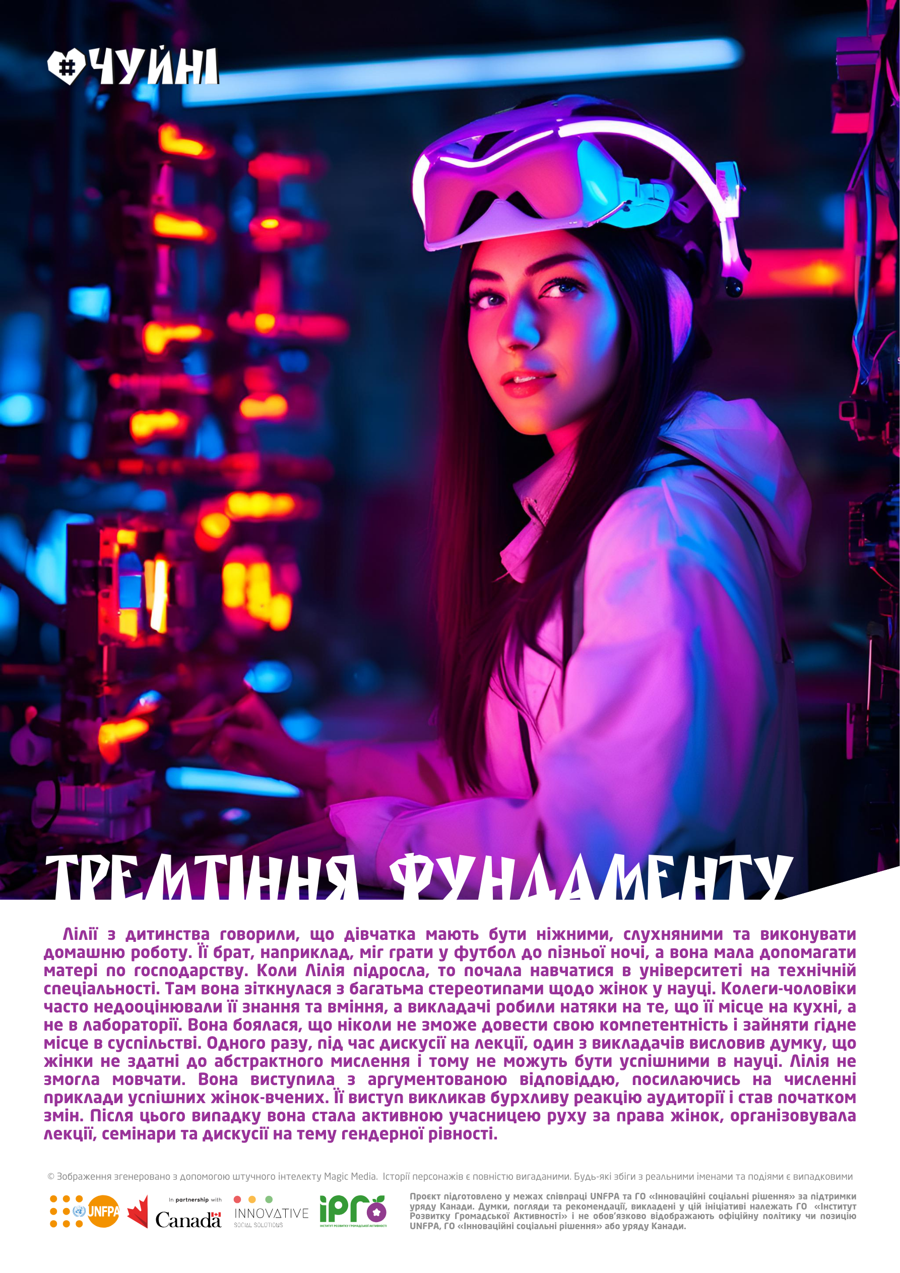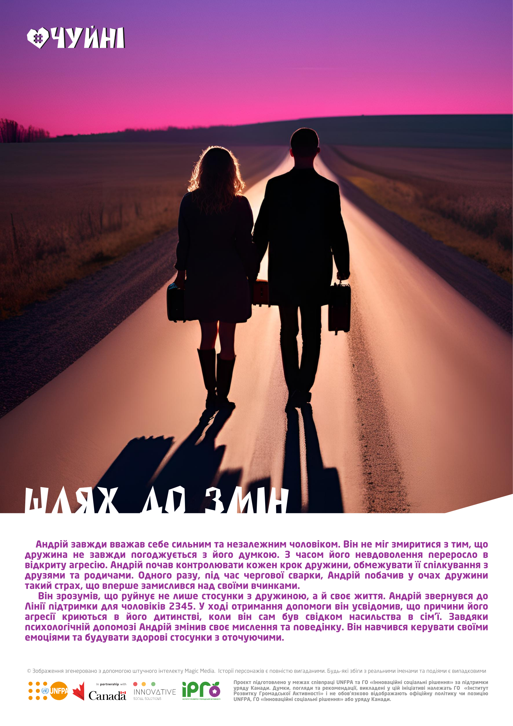 © Зображення згенеровано з допомогою штучного інтелекту Magic Media. Історії персонажів є повністю вигаданими. Будь-які збіги з реальними іменами та подіями є випадковими. Проєкт підготовлено у межах співпраці UNFPA та ГО «Інноваційні соціальні рішення» за підтримки уряду Канади. Думки, погляди та рекомендації, викладені у цій ініціативі належать ГО «Інститут Розвитку Громадської Активності» і не обов’язково відображають офіційну політику чи позицію UNFPA, ГО «Інноваційні соціальні рішення» або уряду Канади.